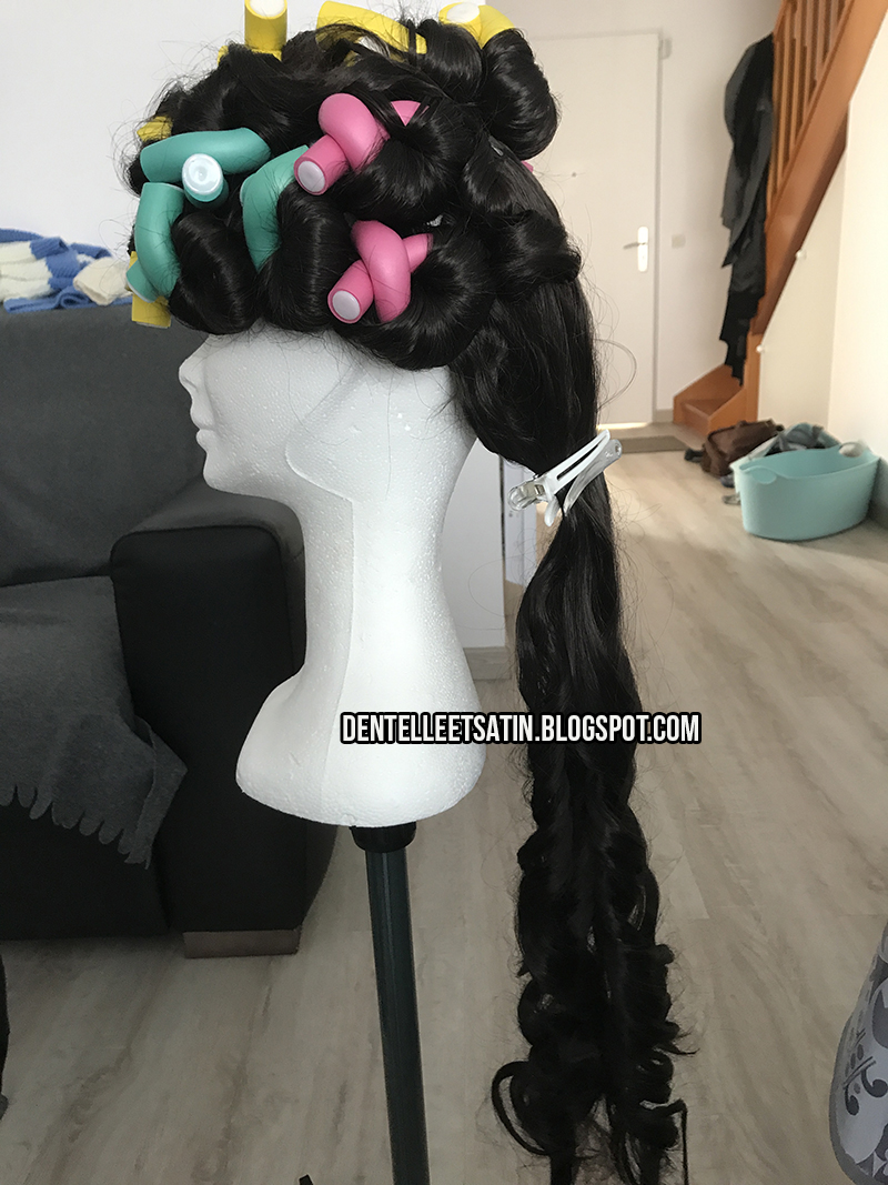 Durant cet essayage j'ai aussi testé la perruque prévue pour cette sortie... autre challenge pour moi. car la coiffure est toujours une étape pour laquelle je galère. J'ai compris que je n'utilisais pas les bons bigoudis et que mes cheveux avaient une nature trop imprévisible. J'optais donc pour la perruque, pour assurer le coup. Au final elle partait bien (elle n'est pas finie, je devais la raccourcir) mais elle était trop foncée et jurait avec mon costume que je voulais "frais". Et drame absolu: elle cachait la queue! Car je voulais quand même de longues mèches derrière. Quitte à faire une perruque, autant faire des trucs qu'on ne peut pas faire facilement avec nos vrais cheveux!